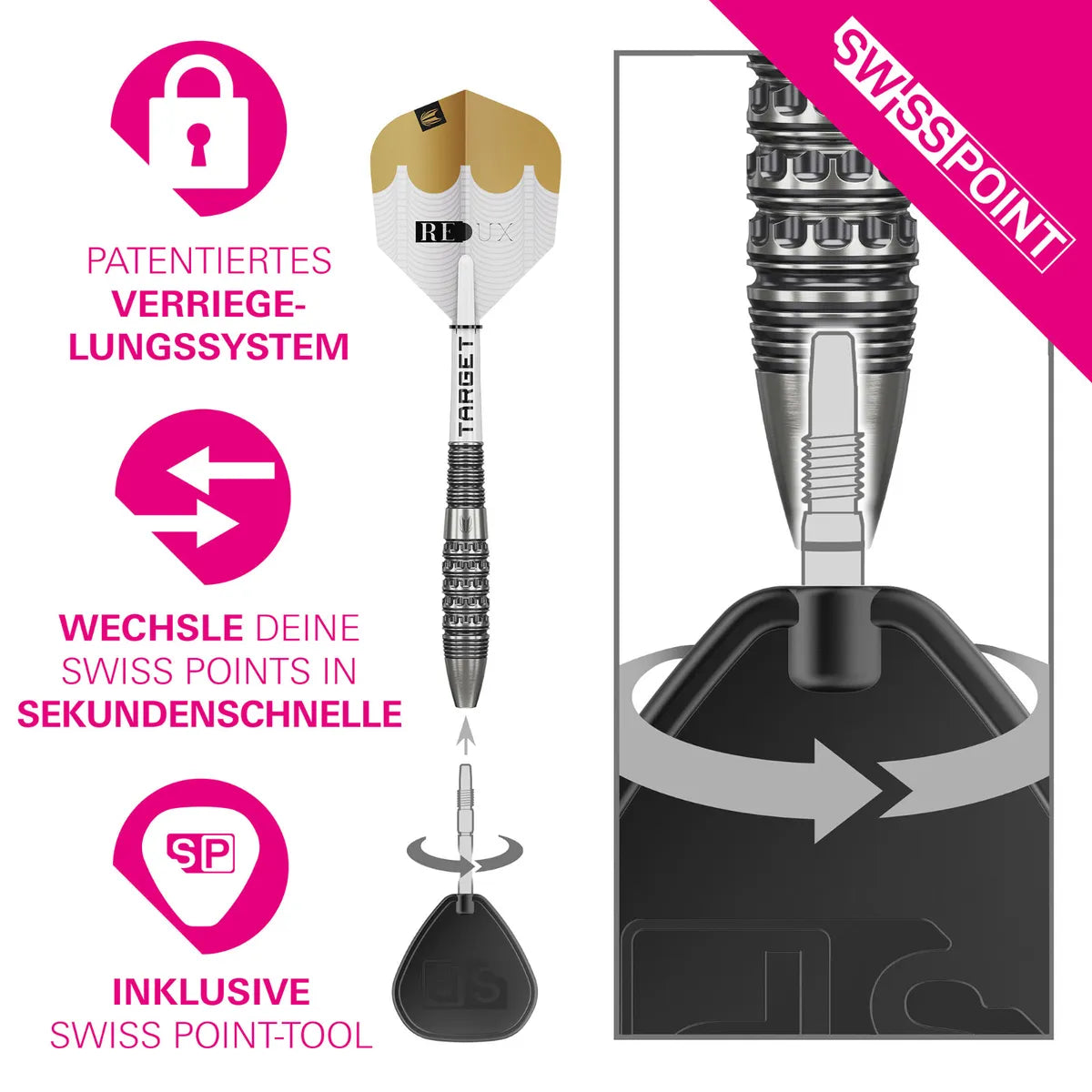 Jedes Dartpfeil-Set enthält Swiss DX-Points, eine erstklassige Kombination aus den Diamond Pro- und Fire-Points von Target. Das lasergravierte Rautenmuster an der Spitze geht nahtlos in einen gefrästen Fire-Grip über und bietet festen Halt in der Dartscheibe. Das Swiss Point-System ermöglicht Point-Wechsel in Sekundenschnelle mit dem mitgelieferten SP-Tool, damit du dein Setup schnell und einfach an die Spielbedingungen anpassen kannst.