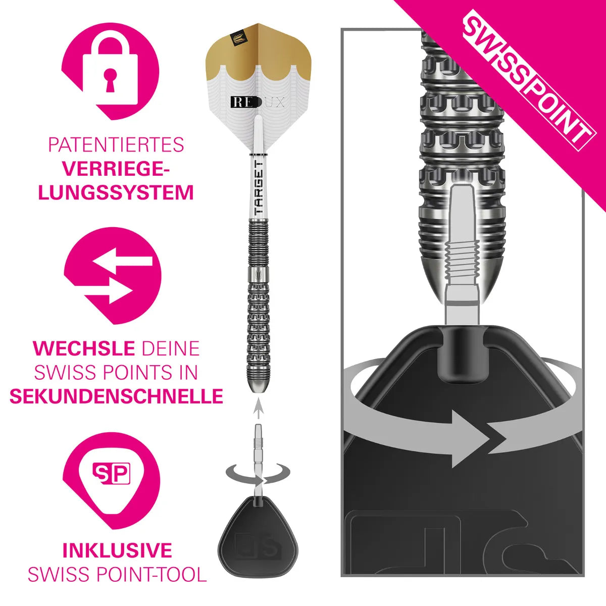 Jedes Dartpfeil-Set enthält Swiss DX-Points, eine erstklassige Kombination aus den Diamond Pro- und Fire-Points von Target. Das lasergravierte Rautenmuster an der Spitze geht nahtlos in einen gefrästen Fire-Grip über und bietet festen Halt in der Dartscheibe. Das Swiss Point-System ermöglicht Point-Wechsel in Sekundenschnelle mit dem mitgelieferten SP-Tool, damit du dein Setup schnell und einfach an die Spielbedingungen anpassen kannst.